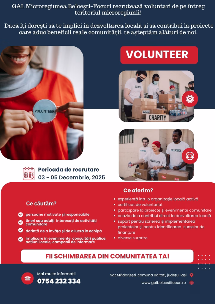 GAL Microregiunea Belcești–Focuri caută voluntari din întreaga microregiune, în perioada 03 – 05 decembrie 2025, în cadrul întâlnirilor de animare ce se vor desfășura în teritoriu.