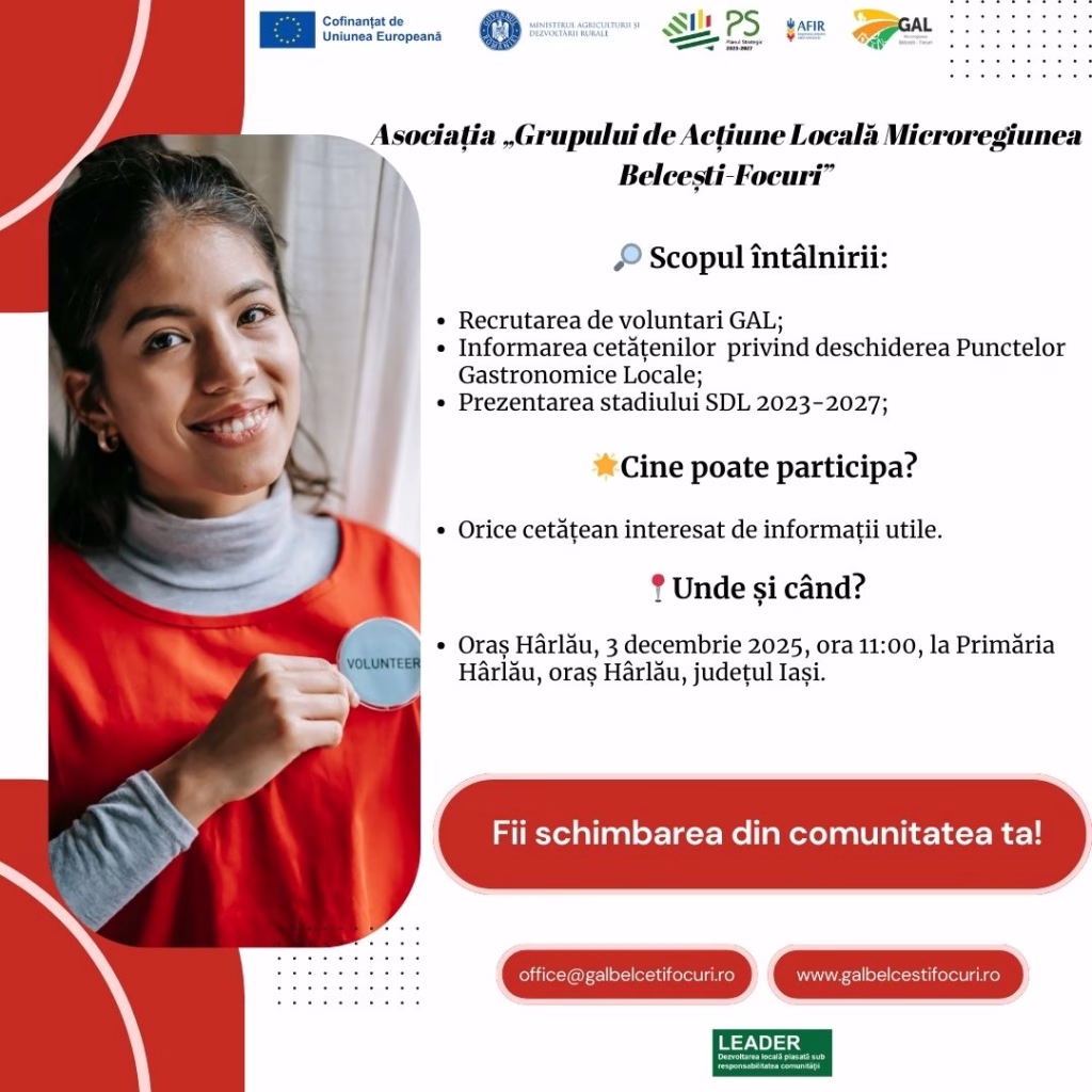 vă invită în data de 03.12.2025, ora 11:00, la întâlnirea ce va avea loc în UAT Hârlău, la Primăria Hârlău, oraș Hârlău, județul Iași, dedicată informării cetățenilor privind: